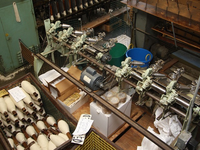 Bobbins await plying and skeining in the finishing area.